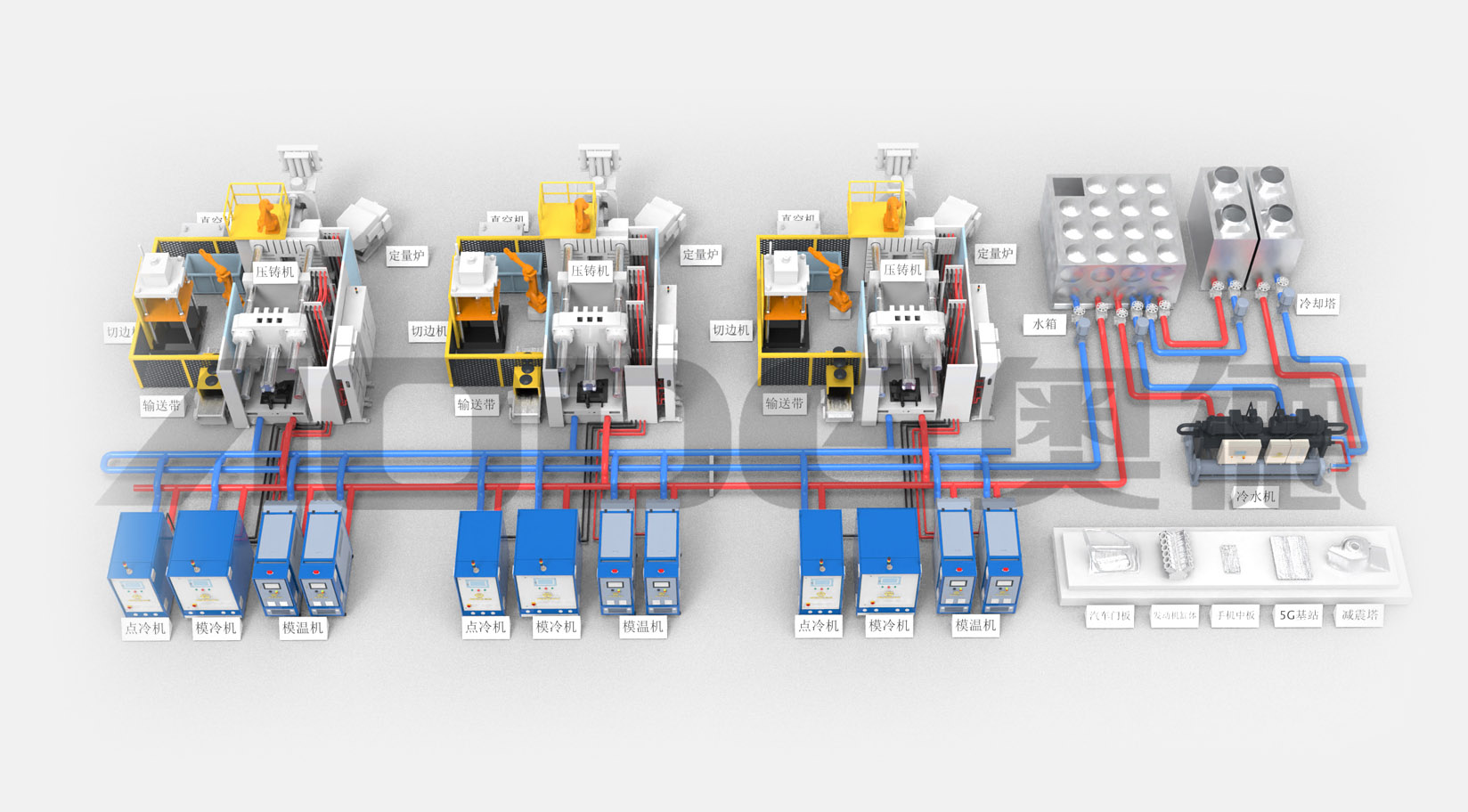 2.壓鑄溫控島一站式交付:模溫機,點冷機,模冷機,冷水機,純水機,模具管道清洗機.